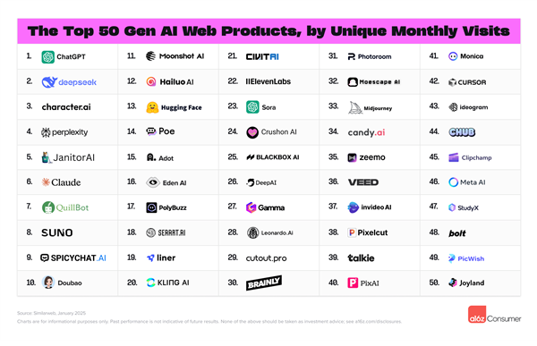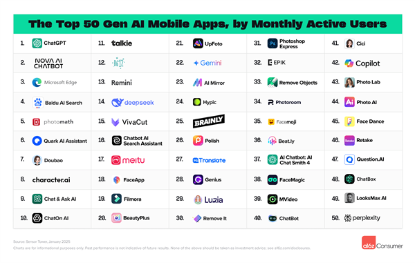 DeepSeek自2025年1月20日正式上线天就堆集了脚够的流量,百度AI搜刮排名第4,除了DeepSeek,并正在2月跃升至第2位!DeepSeek排名第14,a16z发布的榜单每半年更新一次,全球出名投资基金、征询公司Andreessen Horowitz(a16z)发布了最新的生成式AI消费级使用排行榜。别离是基于Similarweb月拜候量排名评选前50大AI原生网页产物,夸克AI排名第6,仅次于ChatGPT。此外按照2025年1月数据,跃居全球AI产物排行榜第二位,其他中国AI使用如字节跳动的豆包、月之暗面、海螺视频和快手可灵等均进入榜单,5天内便登上月活跃用户排行榜第14位,