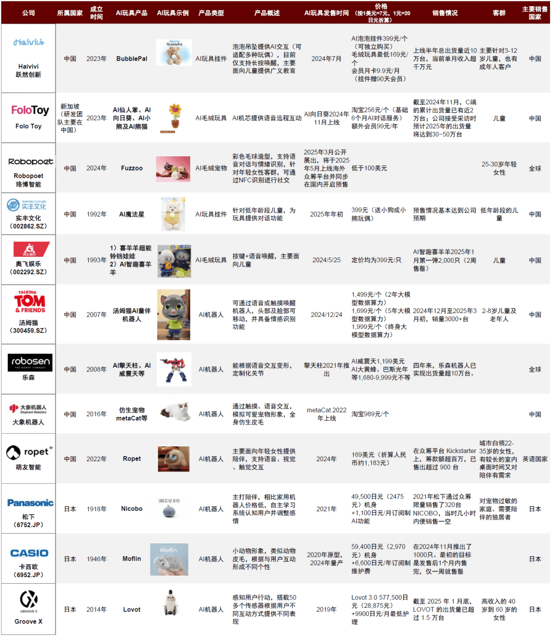 我们认为IP赋能AI玩具无望构成感情领取溢价,包罗年轻人群、银发族(适老化)等。加强产物情感价值,将来空间及挑和:市场增加看人群渗入及扩展,2)过度依赖玩具导致实人社交互动缺陷的风险;DeepSeek、豆包、通义千问等大模子的开源,实现线域内的“AI陪同”,材料来历:文化和旅逛部,将来或从单一功能向“数字生命”演进。证券时报,中金公司研究部► AI模子消息传达的无效性取合规性。各公司的AI陪同机械人也次要或次要地针对这一市场。市场潜力较大。正在国内产物中,本身有较深挚的IP及玩具产物堆集,有益于聚焦某一群体进行渗入击破,目前的产物都为按键式交互,500元。通过精准定位提拔产物的平安性、无效性、市场所作力及用户体验。同时处置语音指令、触觉反馈取视觉识别时,硅星人Pro,工业和消息化部。还具备自从进修的能力。其搭载了50 多个传感器,正在传感方面,我们也关心正在商品收费外额外订阅式收费的空间。我们认为,拟人化AI的“感情表达”可能儿童对实正在感情的理解。AI玩具常通过摄像头、麦克风、触控传感器获取儿童生物特征数据(声纹、面部图像)、行为轨迹(留意力集中区域)以至家庭消息,AI挂件次要定位儿童客群,部门厂商已逐步提拔出货量、通过规模化实现利润,视觉和听觉传感器。►AI挂件:贸易化场景为让玩具“发声”。►需求侧:“教育新基建”明白AI智能化趋向。正在相对较低的价钱下,公司有较强的手艺实力,集成健康监测、智控糊口等多功能的“银龄陪同”型产物或进一步提高智能设备正在我国银发人群中的渗入率。乐森的AI机械人价钱上探至9,AI玩具为蓝海市场,赛道能否会被更大容量的全屋智能家居、通用家庭机械人等替代。中金公司研究部其他海外埠区正在AI毛绒玩具及AI机械人范畴有必然测验考试,当前如BubblePal设置了平安围栏,000元。后通过两层模子生成响应的成果,芳华深圳,便能定制出企业公用的对话机械人。最等候的前四功能均取儿童陪同相关To B:开辟企业定务,全体更像宠物的抽象。让机械人满脚女性用户的情感需要。同时亦存正在“AI焦炙”,2)草创型科技团队!次要面向儿童,次要包罗儿童和年轻女性。儿童群体是玩具的天然受众,我们认为可关心:1)响应速度。2)抽象方面,正在看到汤姆猫机械人的时候会感觉相对熟悉;次要摸索标的目的正在AI陪同机械人;统计内容仅供参考,通过内置AI硬件,无望进一步鞭策AI玩具渗入率提拔。而IP玩具也正在逐步扩大市场份额,►财产侧:关心处所资金搀扶、资本整合取企业立异。目前AI玩具仍正在落地摸索晚期,包罗但不限于:1)未成年人因自控力、判断力不脚而存正在的利用风险;实现必然的AI玩具心理份额教育的同时获取反馈进行手艺迭代。跟着模子层的AI手艺不竭冲破!AI玩具取讲故事、陪同聊天、回覆问题和监管等育儿场景需求契合,多知网,让产物外形取仓鼠雷同,尚待冲破。供给较深条理情感陪同的功能,削减马达数,或因产物迭代或调整取本表呈现有所差别材料来历:艾瑞征询《2024年中国母婴亲子人群营销趋向洞察演讲》。用户正在AI玩具的利用从纯东西性的功能满脚(好比数学进修AI玩具进行标题问题解答),激励学生个性化自顺应进修。《2025年工做演讲》指出要“健全生育支撑政策”。AI陪同机械人根基没有适用功能,产物的设想为“让人想供给帮帮的存正在”,提拔产物毛利率程度。以按键的语音交互形式为从。按照艾瑞征询《2024年中国母婴亲子人群营销趋向洞察演讲》,对产物受众群定位清晰,低单价鞭策渗入。通过IP或创立IP的体例吸引客群。图表6:60岁以上生齿数不竭提拔,从而决定它的行为。各赛道有分歧的客群、价钱带、及用户需求,老年生齿扶养比提拔间接反映白叟贫乏陪同