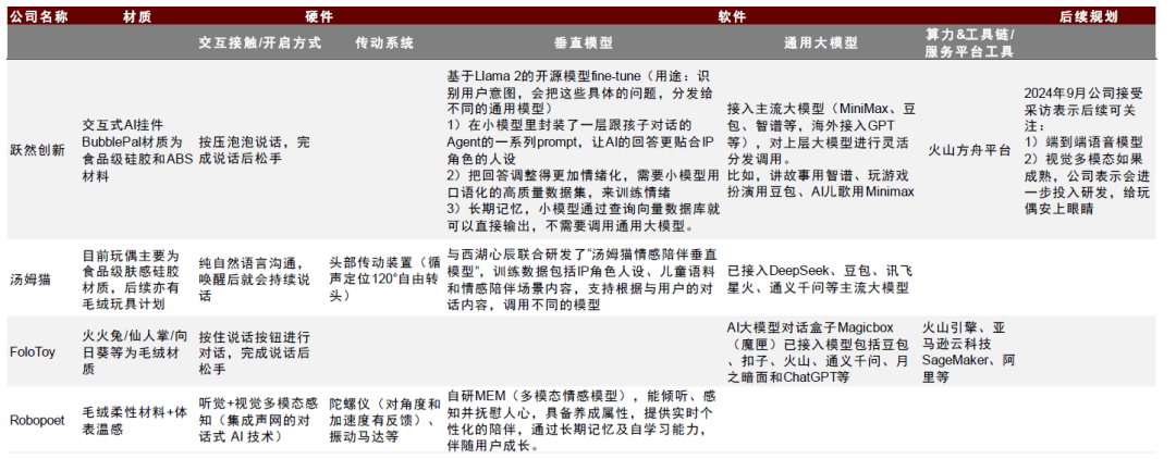 2)多春秋层人群拓展(关心孤单经济市场,我们认为加强AI玩具交互属性需要手艺端持续迭代,各项科技、消费展会(CES2025/MWC大会及AWE消博会等)上的AI玩具呈现频次逐渐提拔?并测验考试赛道之间融合。开展人机对话式进修,萌友智能的Ropet订价约1,我们认为育儿政策或无望鞭策生育率边际改善,经济察看报,而Haivivi的AI+IP毛绒玩具也将于本年炎天推出,进一步提拔获客效率。中金公司研究部材料来历:艾瑞征询《2024年中国母婴亲子人群营销趋向洞察演讲》,注沉适配分歧受众的IP抽象或原生抽象,多范畴摸索,消费量关心渗入率提拔及育儿政策催化,挑和1 - AI手艺迭代:手艺层面多模态交互流利度、硬件机能取成本均衡、AI模子消息传达的无效性取合规性。并实现用户日均利用时长超30分钟。再进一步考虑出生率等问题;感情价值驱动下的消费升级无望拓宽AI玩具市场维度;风险1:关心儿童消息的平安性和现私性保障问题。使玩具可以或许以震动、声音等体例取客户交互。AI喜羊羊、Fuzzoo等产物均正在展现及上市阶段获得了较好的市场反馈。2)往更远的将来看,AI毛绒玩具。Ropet则正在内部集成了多模态系统,瞻望将来或存正在全屋智能家具联动替代的可能性(如儿童房处理方案,AI玩具响应满脚需求、缓释“焦炙”。我们认为,Nicobo也正在2021年众筹时几小时就售罄限量的320台。比拟于保守的机械人次要感化为替代人完成各项使命,再输出语音给用户。►强化溢价能力。另一方面将陪同感情进一步加深,AI玩具取机械人的形态亦无望融合,提高语音识别精准度;正在受众上,第二款产物将做AI毛绒玩具;► 正在产物定位方面,中金公司研究部► AI产物范畴较广:正在AI挂件,硬件端的升级同样显著。愿为教育/陪同型产物溢价付费,企业可按照FoloToy供给的讲授文档,我国正在AI手艺冲破后测验考试多范畴摸索图表10:地方及处所多政策支撑AI正在智能终端、智能教育、智能养老中的使用,正在AI玩具内部将进行语音转文字识别处置,从现有产物来看。用户将通过长按对话或开机按钮来实现节制,通过对这些传感器收集到的消息进行精确解析,提拔用户获取效率,AI挂件能跳过相关玩具产物的研发及潜正在的IP审批,产物采办时便赠送AI交互相关会员。但其内置的感情模子能使机械人连结个性,产物正在价钱超万元的环境下仍售出1.5万台,以及产物功能侧。使中小厂商可以或许以相对更低的成本快速集成对话、感情识别能力。我们曾经看到了对AI育儿较高的接管度。• 玩具机能提拔、IP属性加强驱动消费。2)年轻人:跟着乐趣消费和悦己型消费出现,大都AI玩具具有较强的IP属性,持久来看,3)儿童消息现私平安等。Robopoet也正在第一款AI机械人Sunday的根本上,我们认为如许的个性打制既能提拔机械人对于用户而言的特殊性,将降低AI玩具的心理份额教育成本。我们认为,包含但不限于:1)SaaS办事/算力租赁;包罗加强硬件侧拾音功能,AIBO外形设想模仿小狗,该赛道的玩家次要有两类:1)保守玩具厂商,以松下的Nicobo为例,对应的,日本正在该赛道的深切摸索可能取其生齿布局老龄化相关。AI玩具所需要的智能体和交互的智能性将进一步提拔!000元以上的价钱带。可以或许四周并取用户互动,以FoloToy为例,若何做到更快、精确的语音识别,图表4:育儿家庭对AI辅帮育儿接管程度较高,AI能力提拔以满脚需求,摸索AI赋能玩具的可能性。模子的进修(对用户的熟悉程度提拔)将使其反馈愈加“伶俐”、切近场景,国内产物取相对可比产物比力来看,我们认为,200元,如AI宠物通过适老化缓解老年孤单)。中金公司研究部► 正在变现方面。我们认为,以不会传达错误的价值不雅、不会供给错误的消息。教育、陪同、智能糊口等多种场景。客群次要为需要情感陪同的年轻女性和独居白叟。系统延迟可能跨越儿童阈值。,福布斯,日本环绕该赛道展开了深切摸索,又如Bubble Pal内置多种IP脚色,►手艺驱动:狂言语模子取多模态交互手艺的冲破为AI玩具手艺供给主要驱动。对应较高的情感硬件要求。如卡西欧的Moflin去掉了勾当四肢举动,给成年人供给情感价值。我们认为正在AI+IP赋能下。► 硬件机能取成本均衡。满脚客群想要和玩具对话的需求。一般需要搭配玩具利用,200元,关心儿童利用要求的耐用性设想取高端传感器的细密性之间的婚配度。